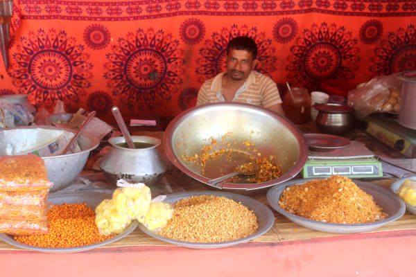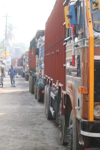 But first we stop at another border crossing with India, at the town of Hili. Luckily on the way, so that it doesn’t take a lot of extra driving. Borders are a thing, with this group, and this one is, at least, actively working. A whole line of empty Indian trucks is waiting to cross back into India. One customs official is specifically perched high on a kind of tennis umpire chair, from where he can look into the open trucks to check if they are really empty. We watch the border for a while, and then continue. T-shirts, anybody?