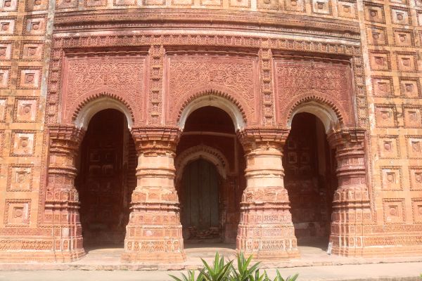 The most impressive religious site, by far, is the old Buddhist complex Paharpur, the most important known Buddhist structure south of the Himalayas. It was built by one Dharmapala, the 2nd emperor of the Pala dynasty, at the end of the 8th Century AD and was called Somapura Mahavihari, or Great Monastery. But from the end of the 9th C the Pala empire suffered repeated attacks from outside, the monastery was burnt down, and by the 12th C the monastery was gradually abandoned for lack of patronage in an increasingly Hindu-dominated environment.