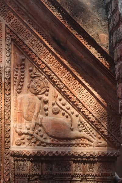 The Puthia dynasty stems from the 15th C, and has been ruling the area until the zamindar system was abolished under Pakistani law in 1950. Many of the rulers were women, and many contributed significantly to public life, amongst others by building numerous temples around the complex. One such is the Bara Govinda temple, a fabulous brick building, beautifully decorated at the outside. Delicate terracotta carvings with battle scenes and other Hindu tales can be found above the entrances. A smaller temple, the Bara Anhik Mandir (large Ahnik temple) is somehow chucked away behind the palace, its front squeezed next to another building, what makes appreciation more difficult. But the decorations are equally, if not more delicate than those of the Bara Govinda.