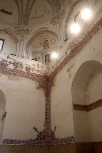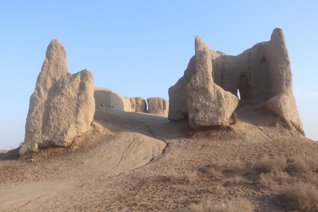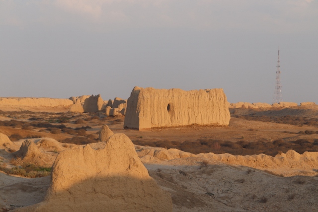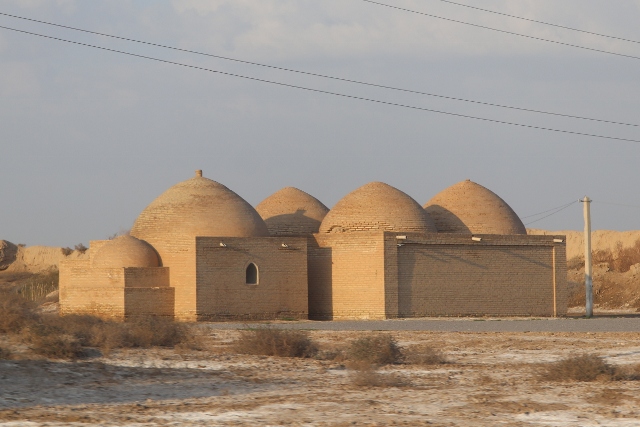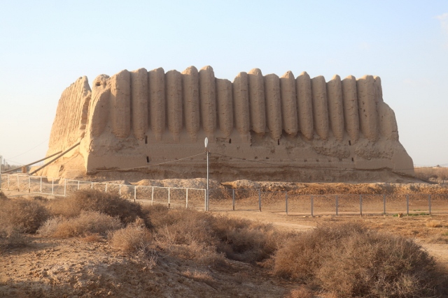 Merv was not a single city but a collection of walled settlements built over time, all in a pretty poor state right now. The largest one is the Soltangala, the Sultan’s fortress, from Abbasid times, which consisted of several kushks, semi-fortified two-story residences of Merv’s elite, whose corrugated walls gave it a unique and striking appearance. The largest and best-preserved structure is the Greater Gyzgala, the maiden’s palace; according to our guide this one was populated by the virgins who the Sultan accumulated, although it doesn’t say anything about whether they remained virgins. The building has extraordinarily thick walls, with deep corrugations, as well as multiple interior stairways leading to second storey living quarters. The second structure in this part of Merv is the Lesser Gyzgala, which has few covered parts by now. In fact, all of Merv’s kushks are in precarious states of preservation. This becomes even more obvious at other neighbourhoods, where only parts of the outer wall remain.