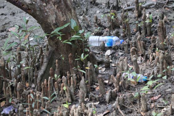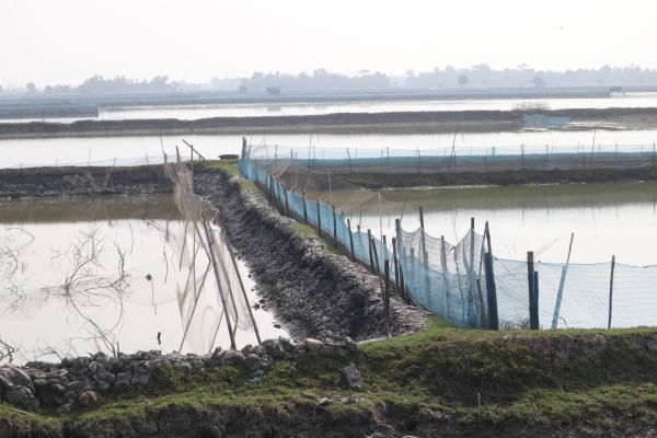On the way, we pass through prawn culture country, with large ponds used to grow prawns. The fishermen’s houses, together with small huts on stilts, over the water, are located at the edges of the ponds, which are separated by coloured fishing nets. Right next to one of those pond complexes we encounter a rubbish dump, the effects of which no doubt seep through into the water.