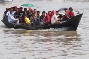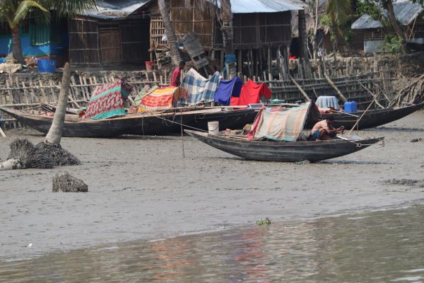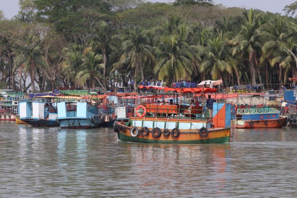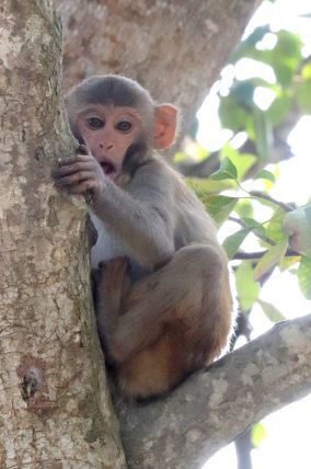 At the port of Mongla we embarked on a small, but exceedingly comfortable boat – soft sofas and sun roof -, for a 40 minutes plop-plop on the Rupsa river, to the Karamjal park. Where we got off, got a ticket, walked past a kind of a zoo, with crocodile cages, a deer enclosure and a single bird, and then took off for our jungle walk. On a concrete, raised causeway, together with hundreds of other tourists, and heaps of rubbish, empty bottles, crisps packages and more, next to the causeway. Fat chance seeing any wildlife this way, or birds. Which we indeed didn’t – except for the few monkeys who will opportunistically seek out the visitors. Halfway is an observation tower, for observing the canopy, and today also used for observing the foreigners: we were as much game to watch as any of the animals in the park, and far easier to spot and to photograph. After less than an hour we were back at the boat, and back on the river. Not exactly what I had expected from the Sundarbans.