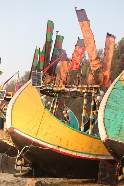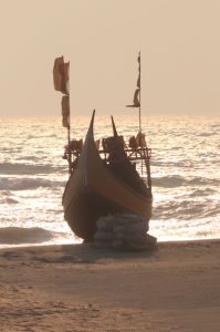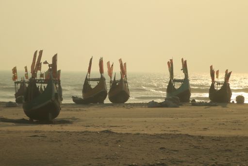 A little earlier, we passed a small ship yard where the fishing boats are refurbished, and some new ones being built. There are various types of boats, but the most curious are the ones with rounded front and back bow. On the way back to Cox’s Bazar there are actually hundreds of those boats, drawn onto the beach on a trailer and stacked in a neat line. Very colourful as well, as each boat is painted differently, and carries a bright flag. The setting sun helps, too.