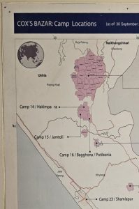We are received by the camp manager, a very able Bangladeshi, who explains some of the challenges. There are more than 100 NGOs and INGOs active, whose contributions need to be coordinated by sector, like Health, Education, Water and Sanitation etc. I know from experience that this is no easy task. He also corrects us, the people here are not referred to as refugees, but as Forcefully Displaced Persons, to highlight the involuntary nature of their migration. And he stresses that the only solution for these people is safe return to their own country, whereby he emphasized the word ‘safe’.