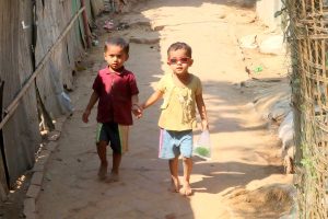 On our walk around the camp we are quickly spotted by two young guys who speak excellent English. Whether we want to meet their chairman? We are guided through some narrow, real narrow, alleys in between shelters – shelters is what you call the temporary accommodation, in this case tarpaulins reinforced with bamboo, and a bamboo roof -, to a wooden structure, the office of one local organisation that advocates for the return of Rohinyas. We politely stay a while, talking about the plight of the refugees, no, the FDPs, and then take our leave again. There is really nothing we can do for these people.