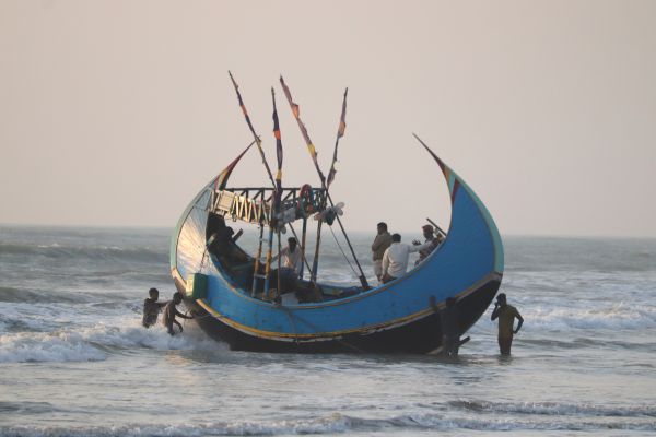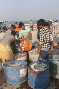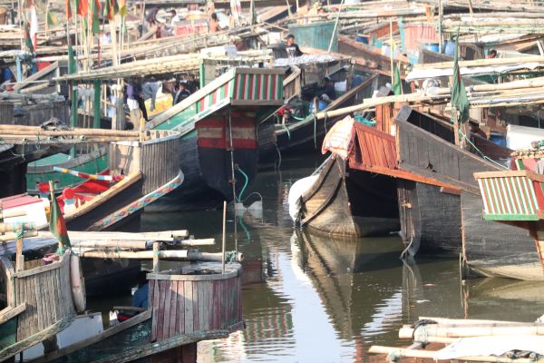What the salt is being used for, we learn when we get to the far end of Bangladesh, Teknaf, from where we do not only look across the river into Myanmar – yet another border on this trip, albeit without the possibility to cross; we also witness the fishermen bringing their catch onshore, where it is immediately packed away in containers, together with the salt, for conservation.