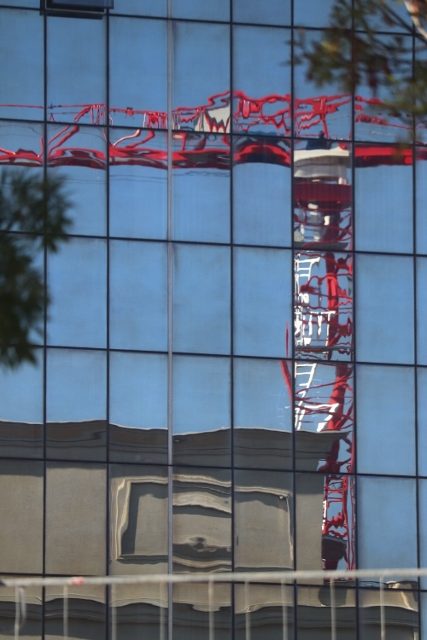 a crane reflected in ne of Belgrade’s hyper-modern buildings – one of the many buiding styles around in this city