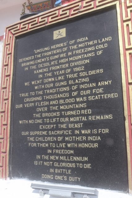 On the Indian side, the war is still being remembered. On the way to the Sela Pass we stopped at one of those monuments, the Nyukmadung Monument, named after the battle here on 17 November 1962. Even the heroic text describing the Indian bravery cannot disguise that the Indians were completely outmanoeuvred and overrun. And subsequently, just after the Sela tunnel, we stopped at another, the Jaswant Gargh Memorial. Jaswant Singh Rawat was a rifleman who single-handedly kept the Sela Pass from advancing Chinese troops for 72 hours, starting 17 November (except that most of the Chinese army bypassed the pass, and reached Tezpur at the Brahmaputra after 48 hours). Jaswant was helped by to two local girls, Sela – after who later the pass was named – and Nura – who was later remembered in the Nuranang Falls. What is nice, is that this memorial also provides room for the Chinese victims, many of whom have been buried here.
