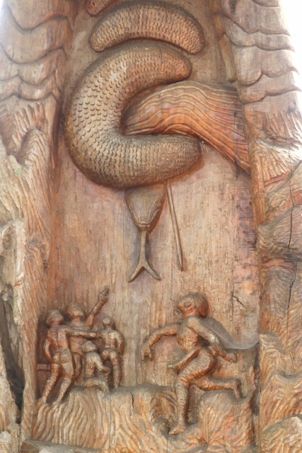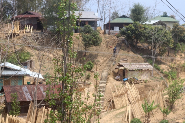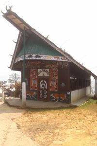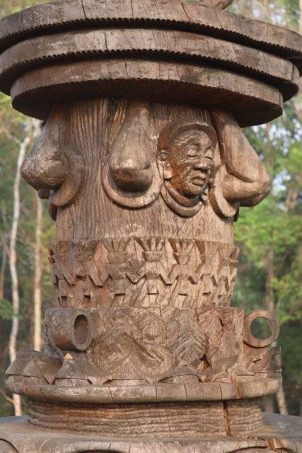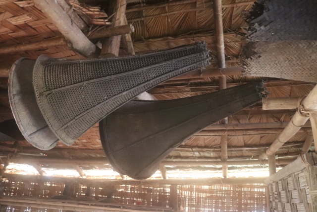 Likewise, there is – part of the museum – a small park, with a pond and a suspension bridge, that leads to a sculpture park. The six more than life size sculptures here tell several of the traditional stories, including the most famous one, of Jina and Etiben, the Ao version of Romeo and Julliet, who eloped – to Longkhum, the first village we visited -to get married against the will of their respective clans. Other sculptures tell other stories; the point is that once again it is nicely done, and it shows the pride the Ao, and the Naga people in general, have for their cultural heritage.
