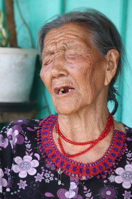 A random woman, old but still active with running her household, calls us in for tea – there is no declining, that’s not done. So we accept her invitation, and she immediately bullies her husband to the stove. Through our guide we manage some communication, whilst drinking our milk tea, before we take our leave, and wander on, further through the village.
