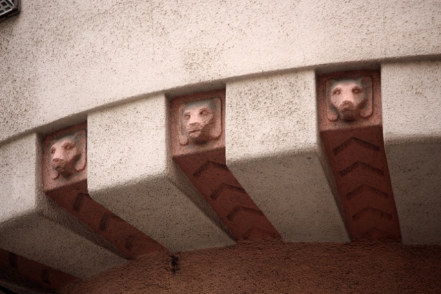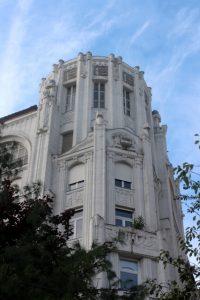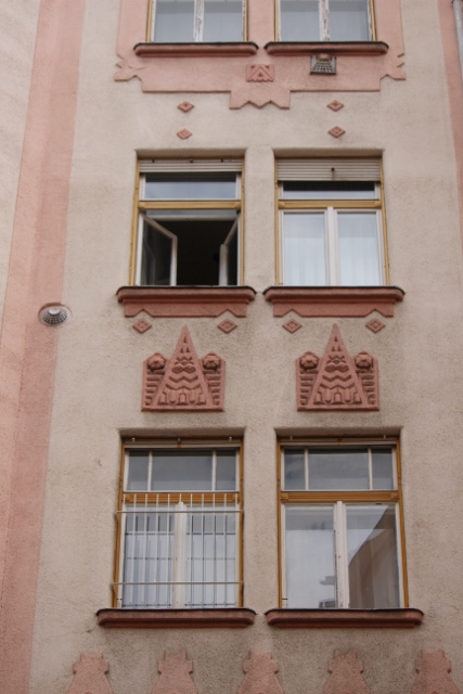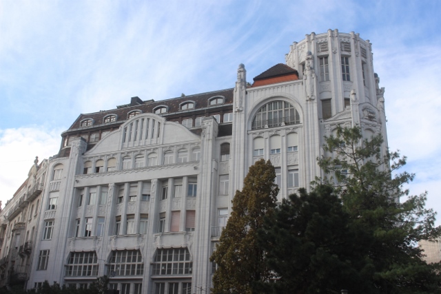 The brick apartments along Karoly Boulevard, one of the main thoroughfares through Budapest, are Art Deco, although perhaps less spectacular that some of the individual buildings. There is this red building, with a half-round tower at the corner, which is of more interest, because of its tiny decorations under the half-tower, and the various window decorations. The arch under a building complex at Madach Square, at the entrance of the Jewish quarter, is a great example of Art Deco, and so are the buildings in the street behind, with their rounded, but geometrical balconies.